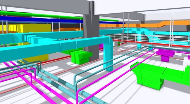 復因項目建筑面積6000平方米,其中凈化廠房面積2500平方米,主體結構以潔凈工程為主,存在夾層空間較小從而導致管道密集的問題。天俱時集團BIM中心團隊為解決這一難題,助力業主在后期清晰分辨送風與排風系統以提高維護效率,通過BIM技術將送風與排風管道分別設置于兩個不同的高度層面,大大提高了送排風系統的空間管理性。